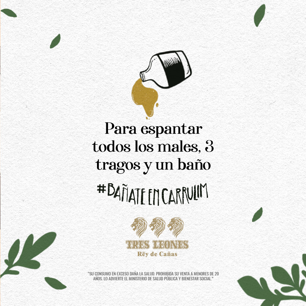 Porque 7 tragos no fueron suficientes para cortar con la mala racha del 2020, Tres Leones nos invitó a “Bañarnos en carrulim”. El nuevo ritual consistió en un kit de baño orgánico que contiene jabón con ruda y caña, shampoo con hierbas, limón y miel, un alcohol al 70% con ruda y limón.